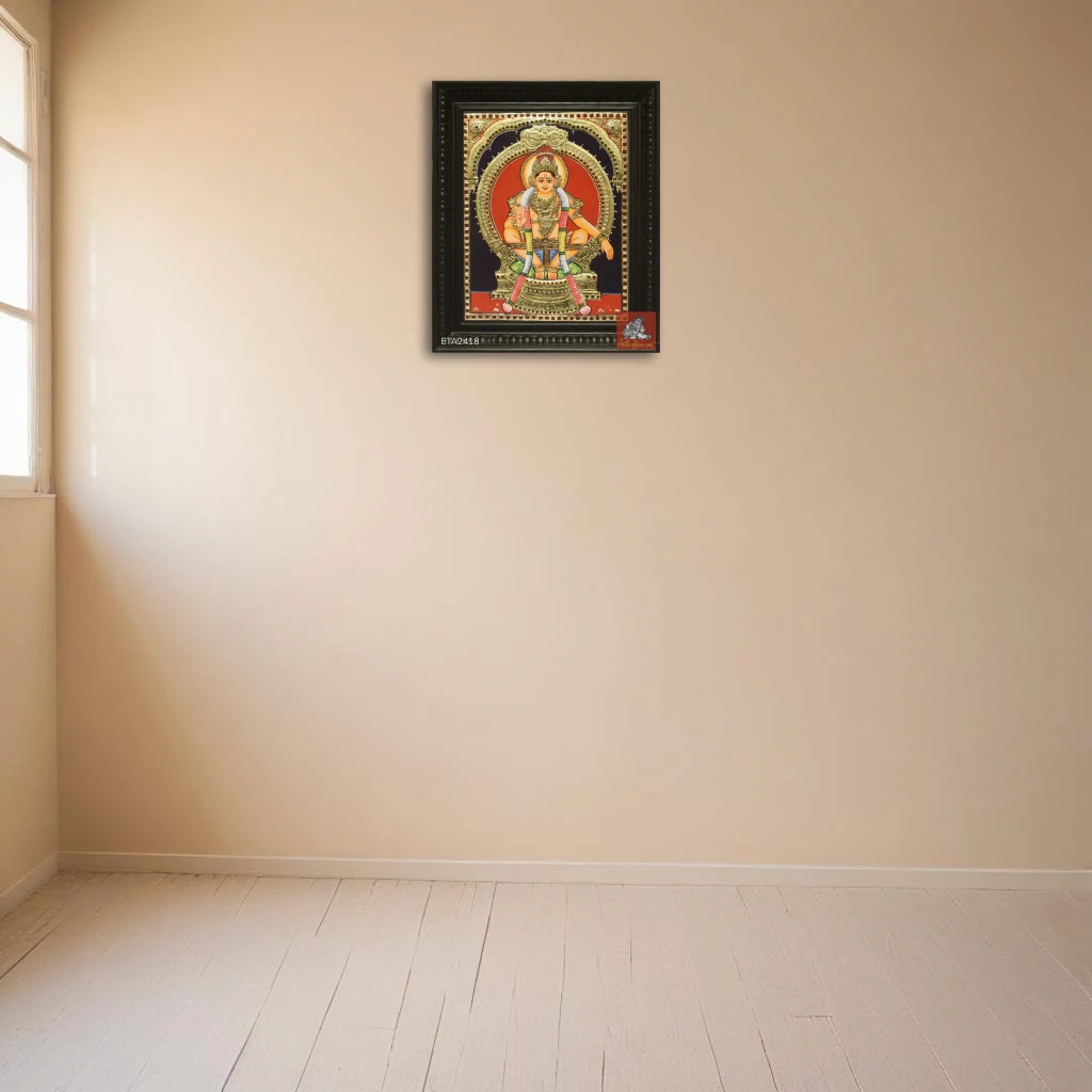 Lord Ayyappan, also known as Manikandan, is a popular Hindu god worshipped in Kerala and Tamil Nadu. He is believed to have come from Lord Shiva and the mythical Mohini, an avatar of Lord Vishnu. Ayyappa's mission was to kill Mahishi and help her achieve Moksha. This handcrafted Lord Ayyappan Tanjore painting features a meditating yoga pose with authentic grand-look shiny colors and high-quality finishings, including 22-carat gold foil leaves and semi-precious stones. The painting is suitable for various settings, including home walls, pooja rooms, office interiors, reception halls, shopping showrooms, and study rooms. Custom sizes can be accommodated based on consumer demand.