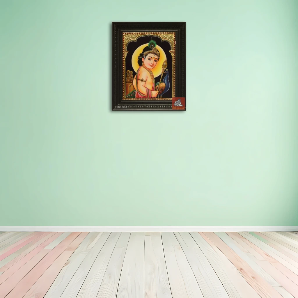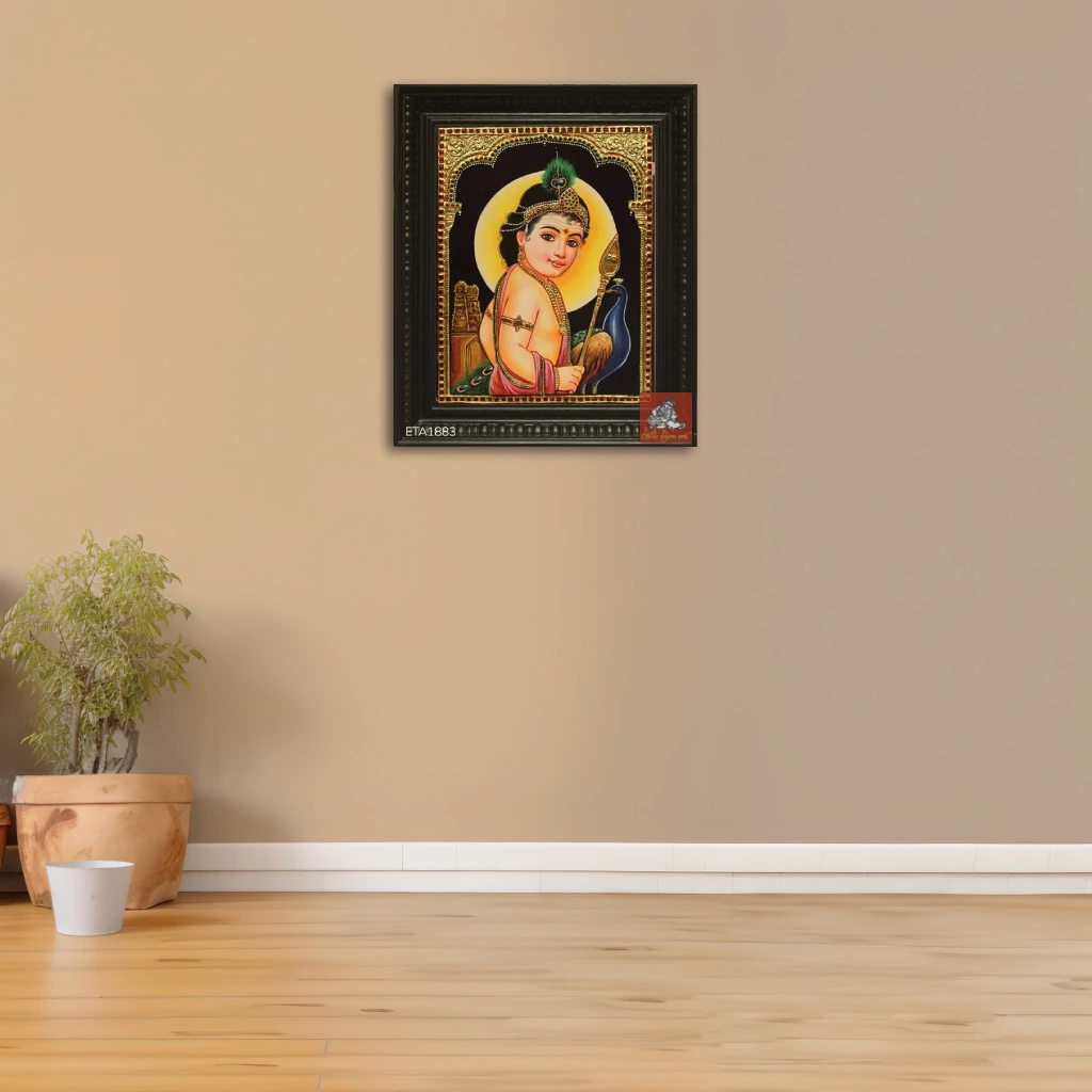 Name of Painting : Lord Bala Murugan Tanjore Painting Size: 12x10 Inches Finish: Gold Foil Type: Tanjore panting Type of frame: Chettinad wooden colour: Multi-colored pack content: 1pc Material: Plywood, Chalk powder, Gold foil, Semi precious stones