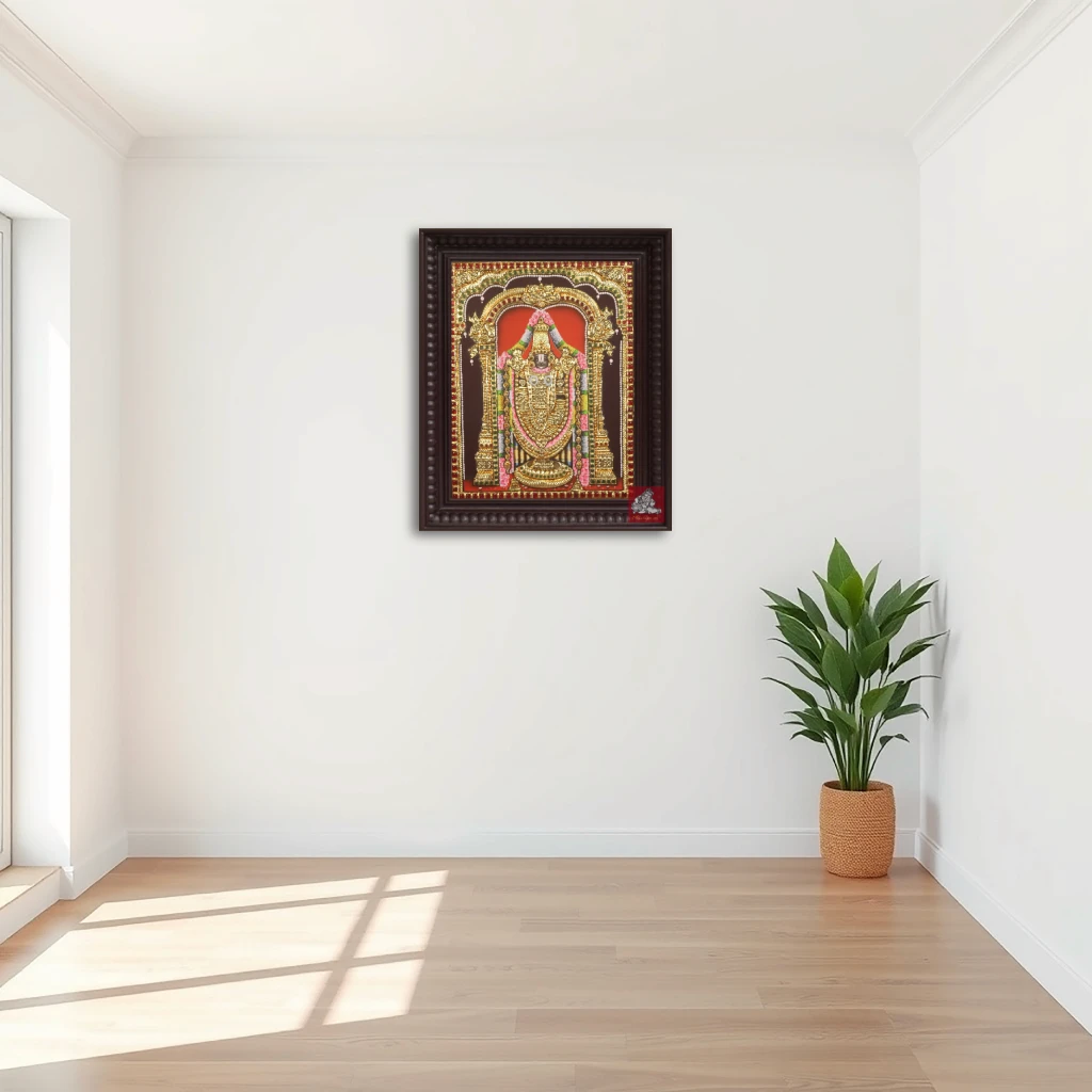 This naturally looking Tanjore Painting on Lord Balaji features rich and vivid colours. The painting features authentic 22 Carat gold foil and Jaipur gems to create a luxurious three dimensional that portrays realism and divine aura. The intricate designing of the temple arch lavish use of gold and the beautiful representation of the garland, with striking colours of pink, green, white and yellow along the deity raises the bar of Tanjore Paintings to extreme divinity. The emphasis given on the motifs play a vital role as well. The artwork appears almost sculptural with a realistic lifelike image of Lord Balaji.