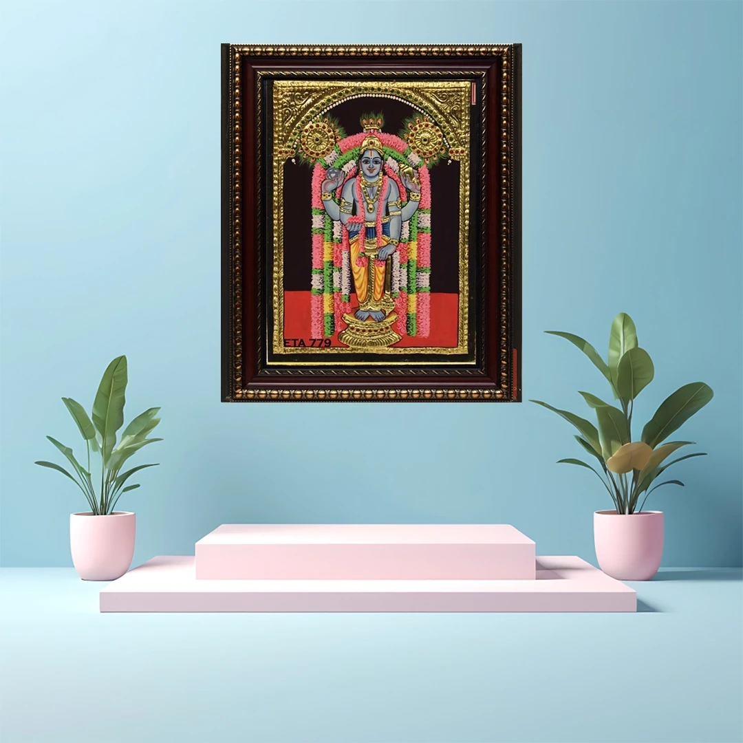 Lord Guruvayurappan is one of the avatars of Vishnu, comes from the words Guru. He is worship in Kerala, South India. Ethnic Tanjore Arts offers a large collection of Guruvayurappan tanjore paintings made with 22 carat gold foils.