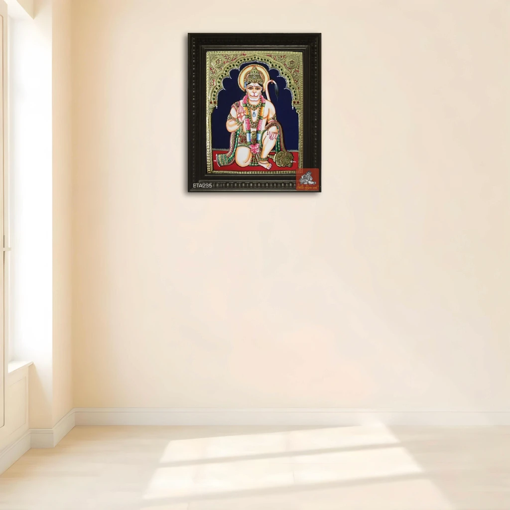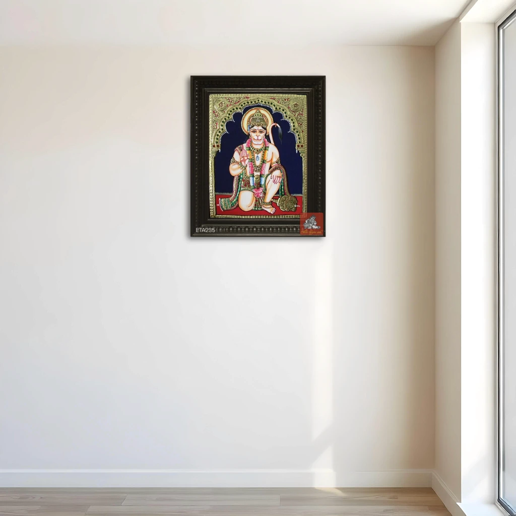 Name of Painting : Hanuman Tanjore Painting Size: 8x10 Type: Tanjore panting Type of frame: Chettinad wooden colour: Multi-colored pack content: 1pc Material: High-quality canvas and gold foil
