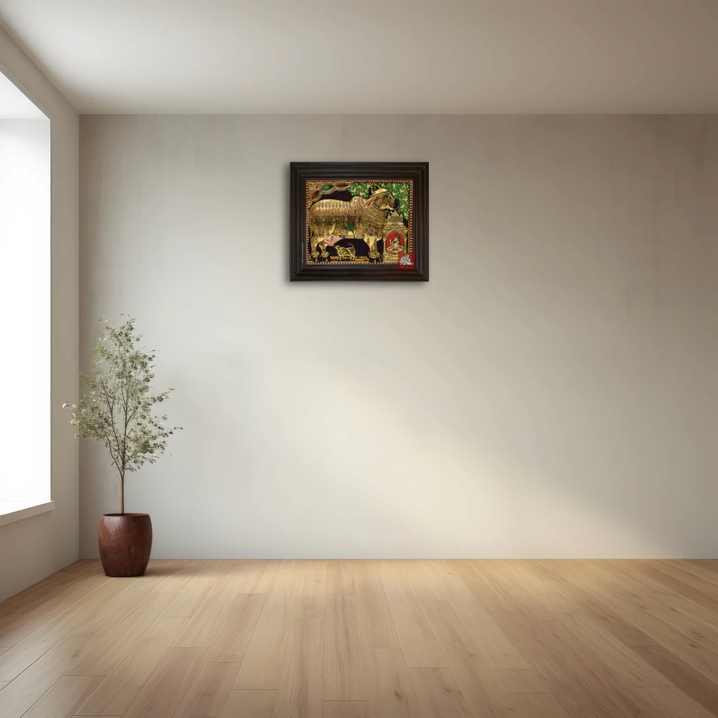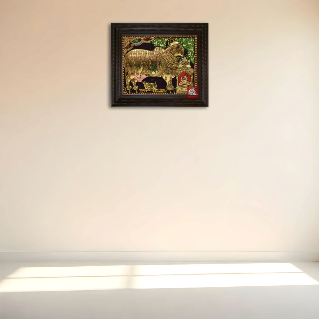 Kamadhenu Tanjore painting beautifully portrays the divine cow, symbolizing wealth and wish fulfillment. The intricate details showcase Kamadhenu adorned with exquisite jewelry, surrounded by lush landscapes and traditional motifs. Highlighted by luxurious 22K gold foil and finally framed in Chettinad wood, this artwork radiates elegance and serenity. This painting is a dedication to Lord Kamadhenu, intended to offer a sense of calm and spirituality to your house. It serves as a powerful reminder of prosperity and divine blessings, making it a perfect centerpiece for your home, inviting good fortune and wealth into your life.