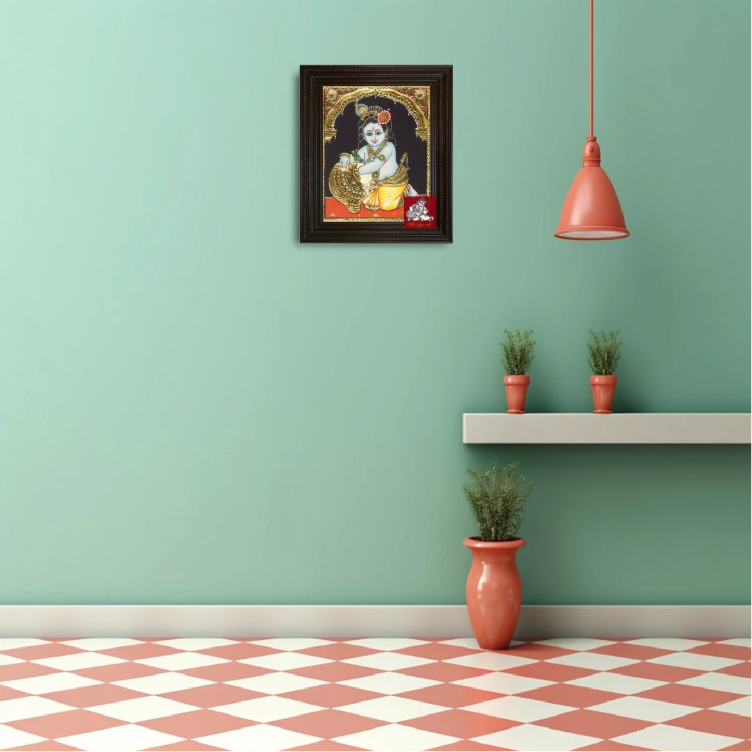 Pattern Lord Krishna Tanjore Painting Color Multi-colored Size 12×10 Finish Gold Foil Type Of Frame Chettinad Wooden Material Plywood, Chalk powder, Gold foil, Semi precious stones,poster colors Usage Pooja room, Wall Decoration, Interior Decoration Brand Ethnic Tanjore Arts