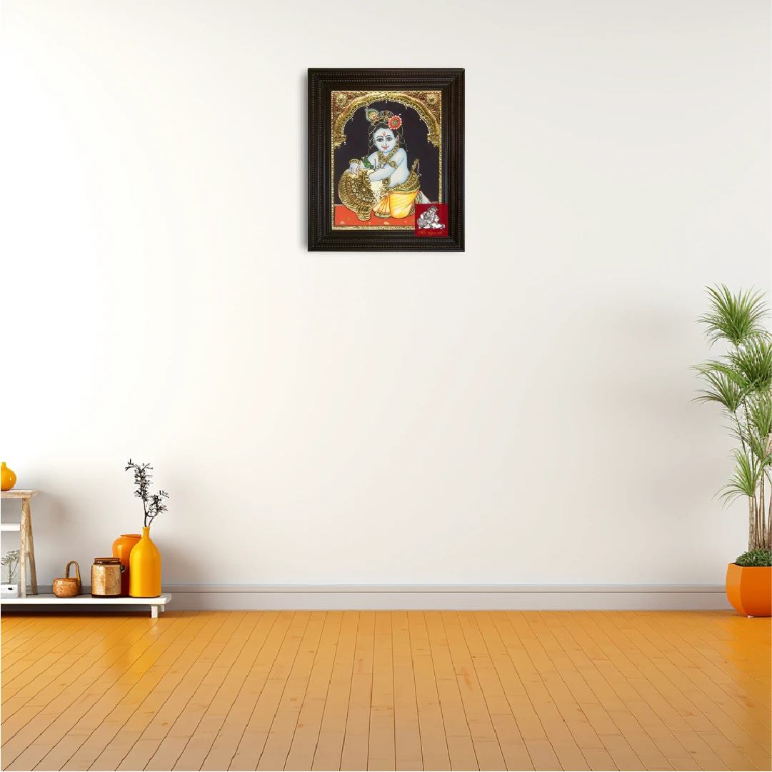 Lord Krishna Tanjore Painting Ethnic Tanjore Arts offers a huge collection of Lord Krishna Tanjore Painting with 100% original hand made painting with any customized size. Beautiful presents for any auspicious occasion for your loved one. Material Used: Original 22 Carat Gold Foils, Chettinad Teak Wood, Shiny Paints, Ordinal Jaipur Precious Gemstone, Cloth, and chalk powder. Frame Used: Authentic Chettinad Teak Wood frame with customized sizes Used for: Home Walls, Pooja Rooms, Office Interiors, Reception Halls, Reception, Shopping Showrooms, Study Room and More.