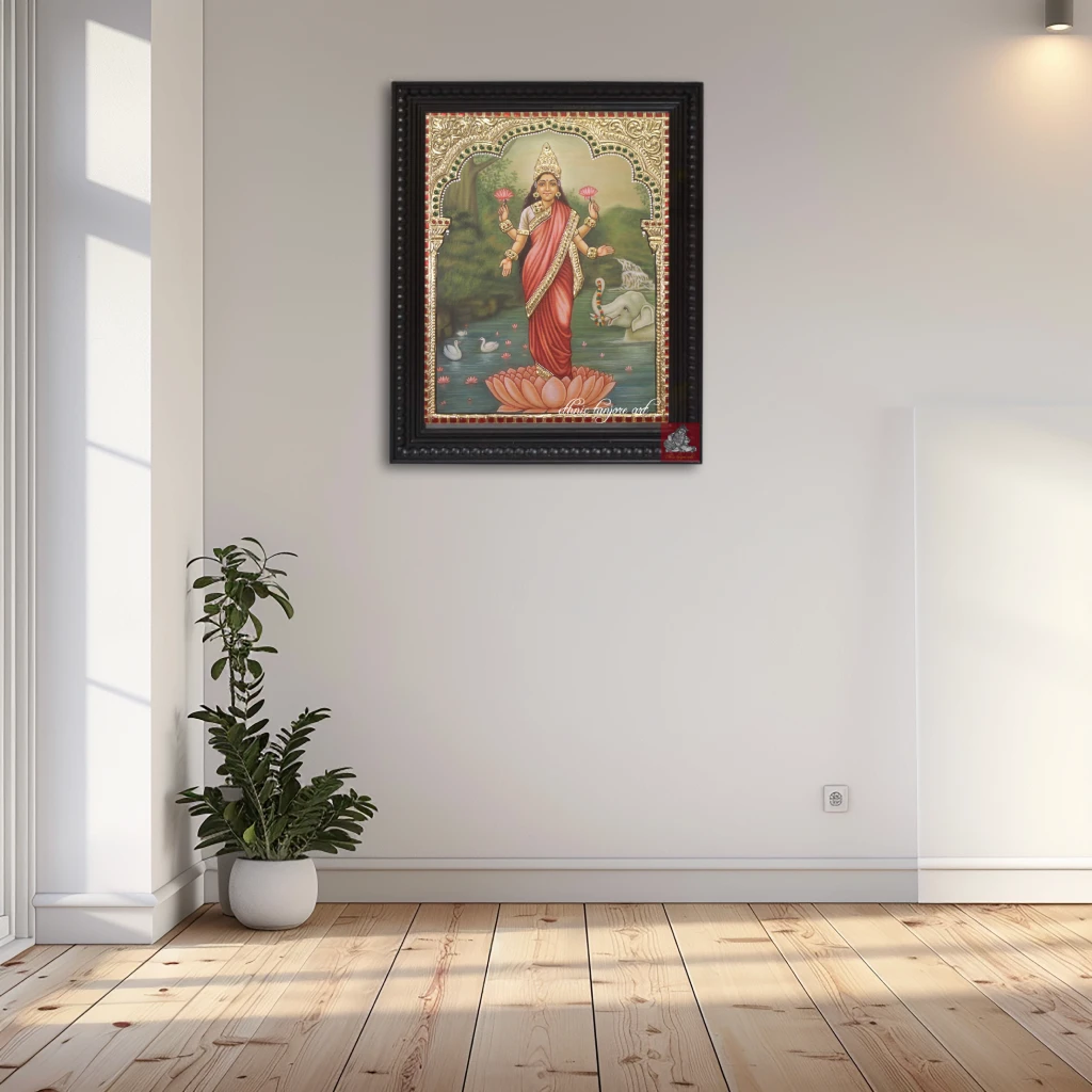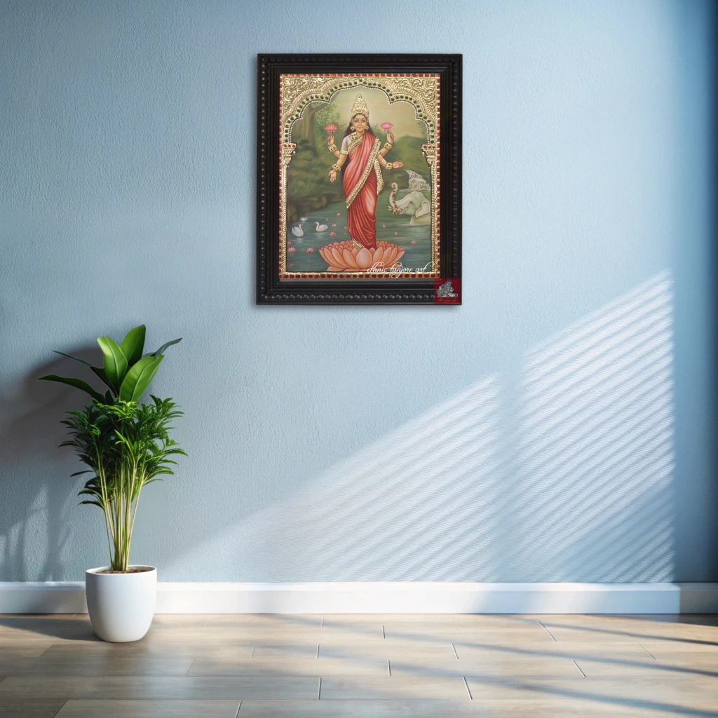 Name of Painting : Lakshmi Ravi Varam StyleTanjore Painting Finish: Gold Foil Type: Tanjore panting Type of frame: Chettinad wooden colour: Multi-colored pack content: 1pc Material: Plywood, Chalk powder, Gold foil, Semi precious stones