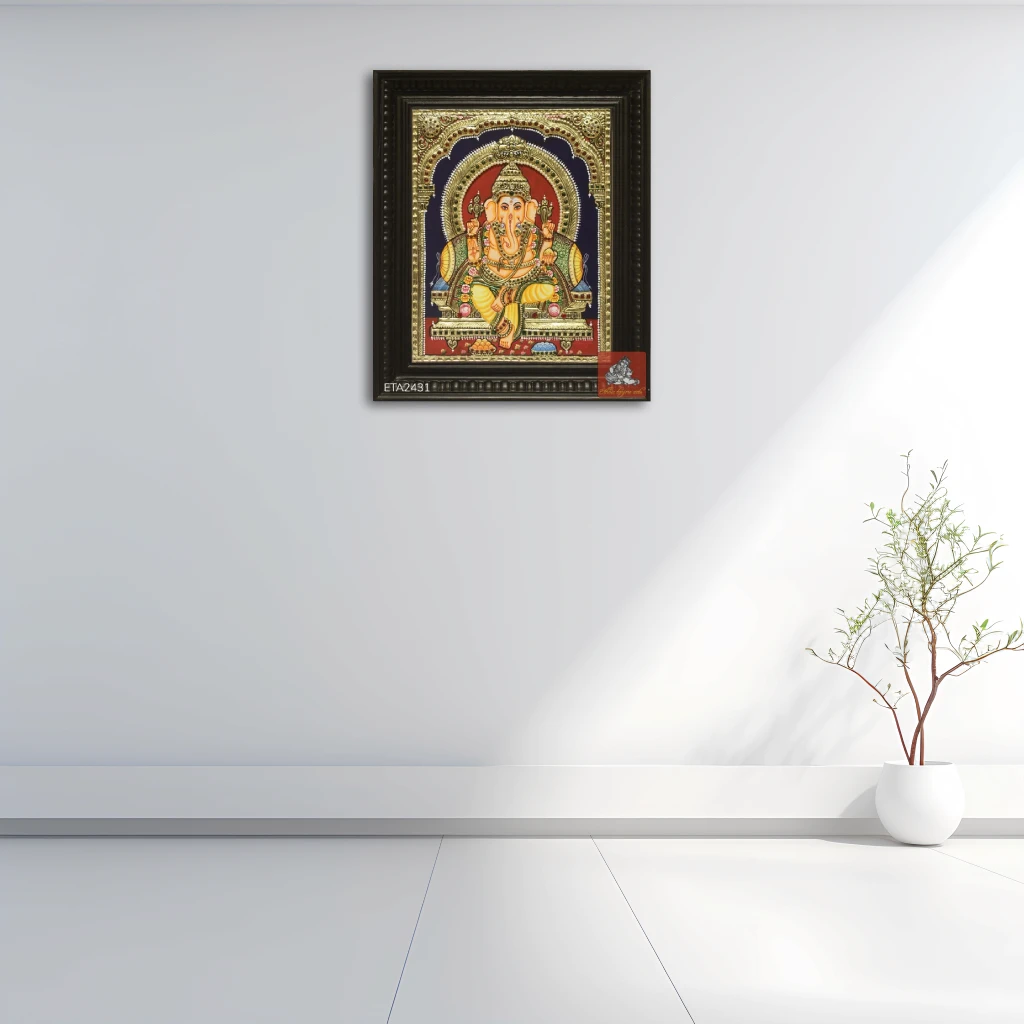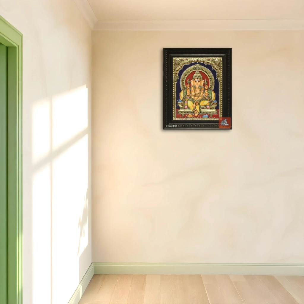 Lord Ganesha, also known as Vinayaka, Ganapati, or Ganesh, is a renowned godhead in Hindu temples, known for his intelligence and sense. After returning to life with an elephant head, Ganesha was endorsed by Lord Shiva, who admired him the most. He is considered the favorable god of people and children. Ganesha Tanjore painting showcases the unique ethnic art of Tanjore, known for its exquisite handwork and attention to detail. Our Tanjore painting Ganesha offers a wide range of designs, including dancing, sideface, and leaf Ganesha. Our semi-embossed, fully-embossed, and flatwork Tanjore paintings are highly sought after, adorned with Vaahan mice and Ladoos in Pooja rooms. They are believed to bestow success, victory, luxury, wisdom, and harmony on homes.