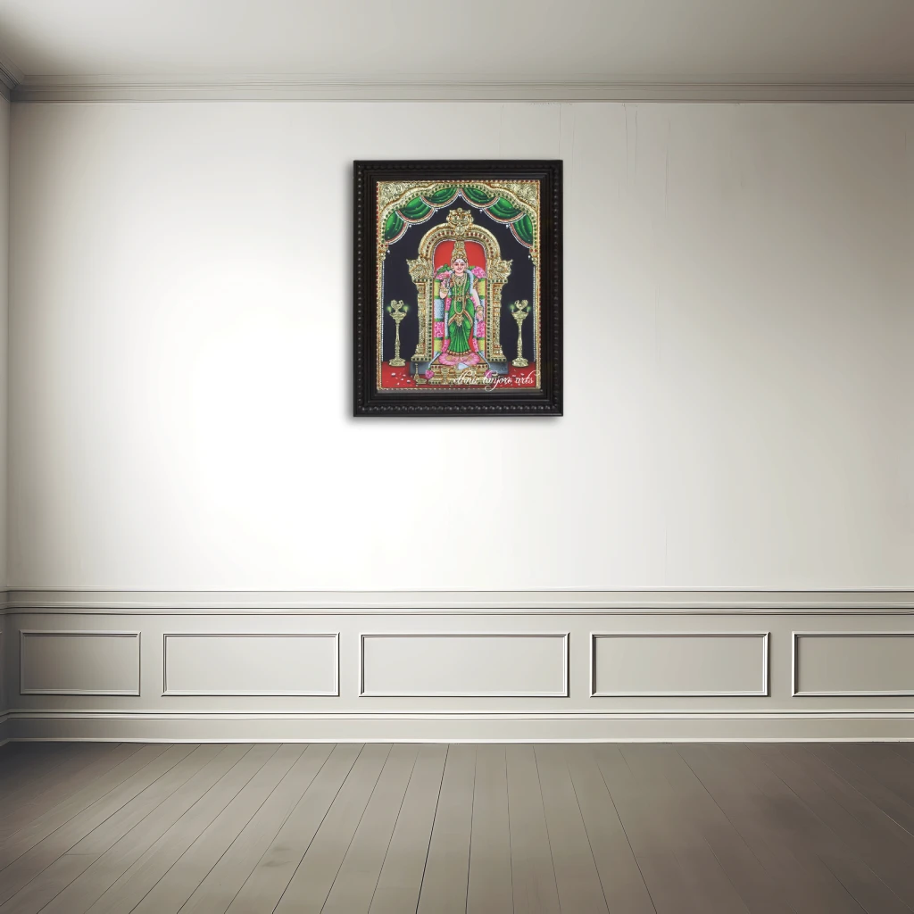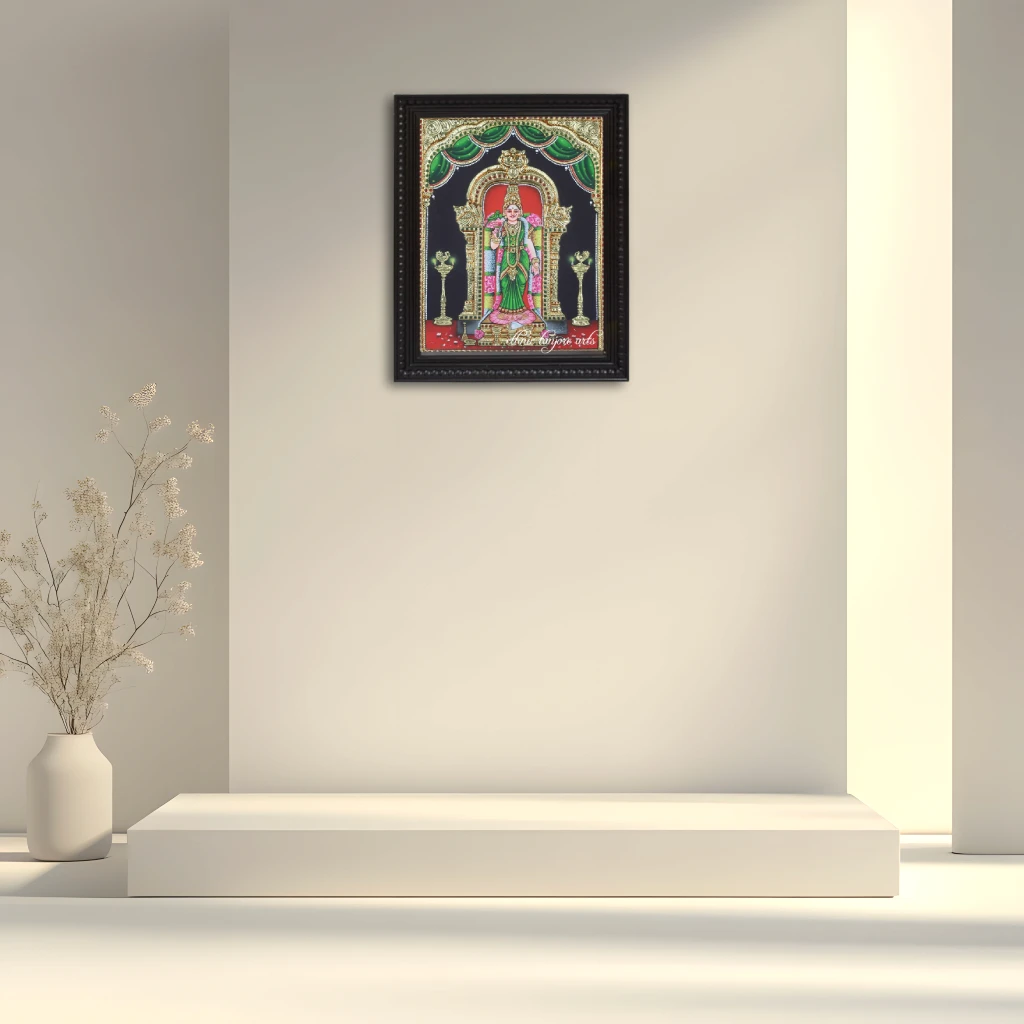 Name of Painting : Meenakshi Amman Tanjore painting Finish: Gold Foil Type: Tanjore panting Type of frame: Chettinad wooden colour: Multi-colored pack content: 1pc Material: Plywood, Chalk powder, Gold foil, Semi precious stones