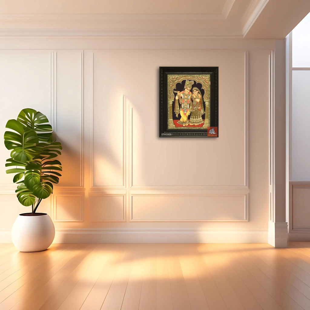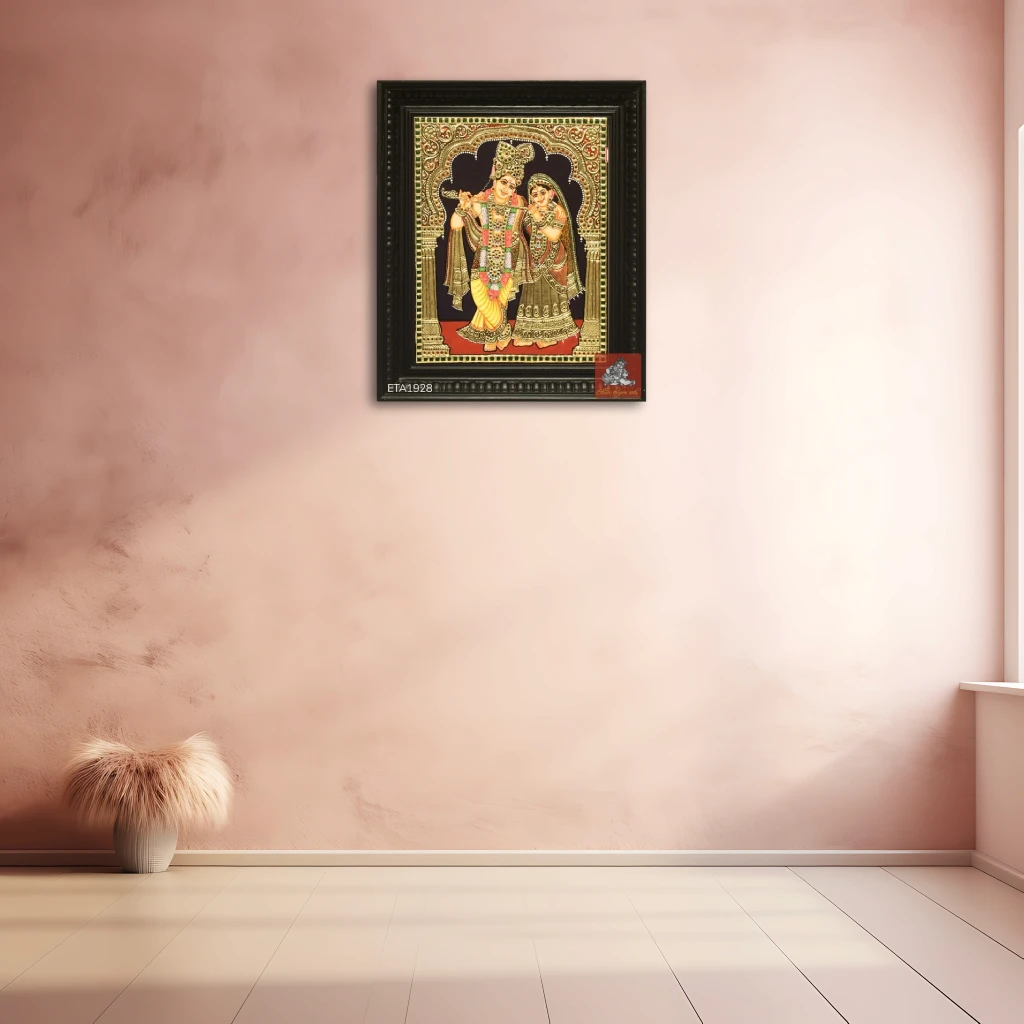 Name of Painting : Radha Krishna Tanjore Painting Size: 12x10 Finish: Gold Foil Type of frame: Chettinad wooden colour: Multi-colored pack content: 1pc Material: Plywood, Chalk powder, Gold foil, Semi precious stones