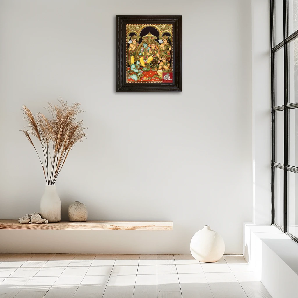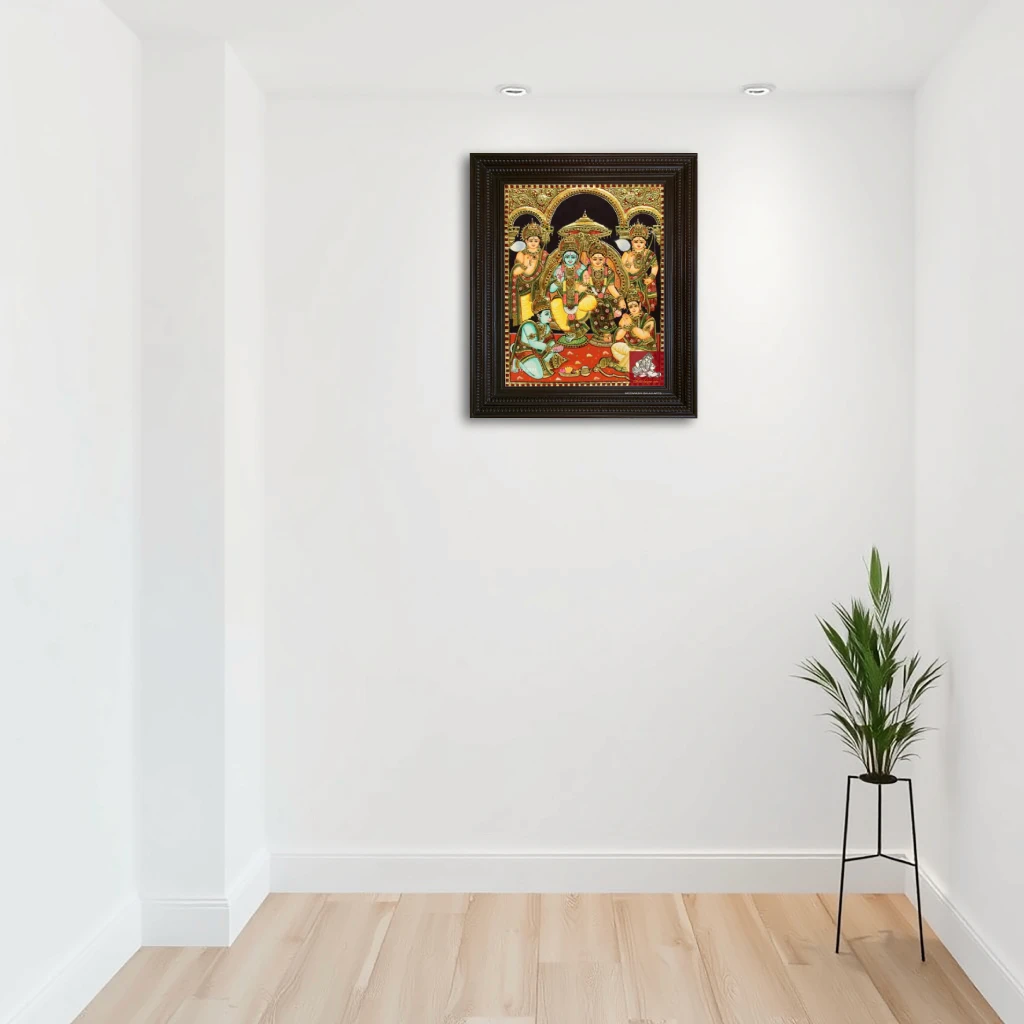 Pattern Ramar Pattabishakam Tanjore Painting Color Multi-colored Size 18x14 Finish Gold Foil Type Of Frame Chettinad Wooden Material Plywood, Chalk powder, Gold foil, Semi precious stones,poster colors Usage Pooja room, Wall Decoration, Interior Decoration Brand Ethnic Tanjore Arts