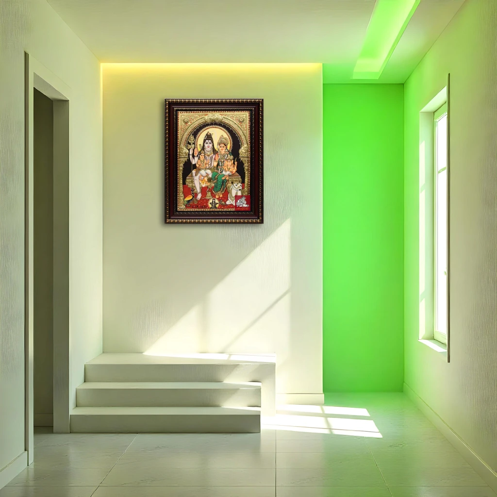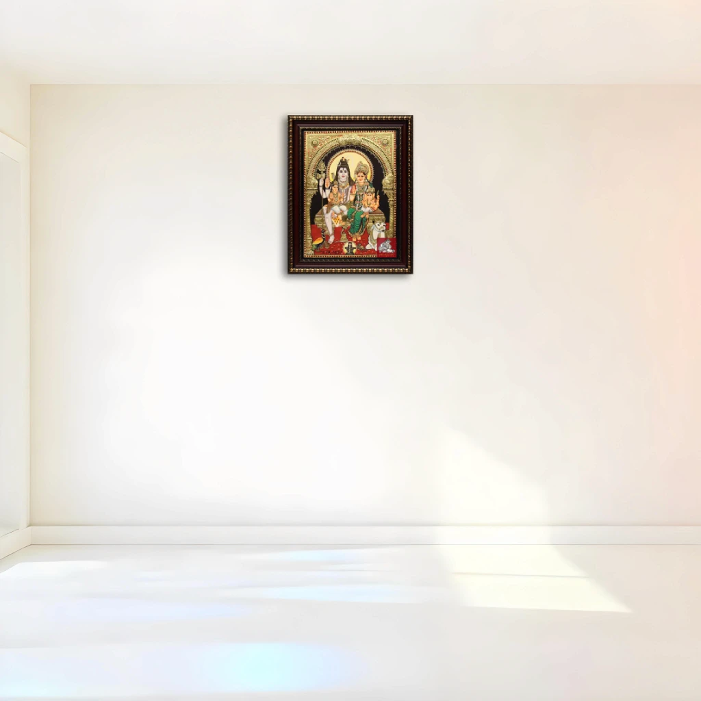 Name of Painting : Shiva Family Tanjore Painting Finish: Gold Foil Type: Tanjore panting Type of frame: Chettinad wooden colour: Multi-colored pack content: 1pc Material: Plywood, Chalk powder, Gold foil, Semi precious stones