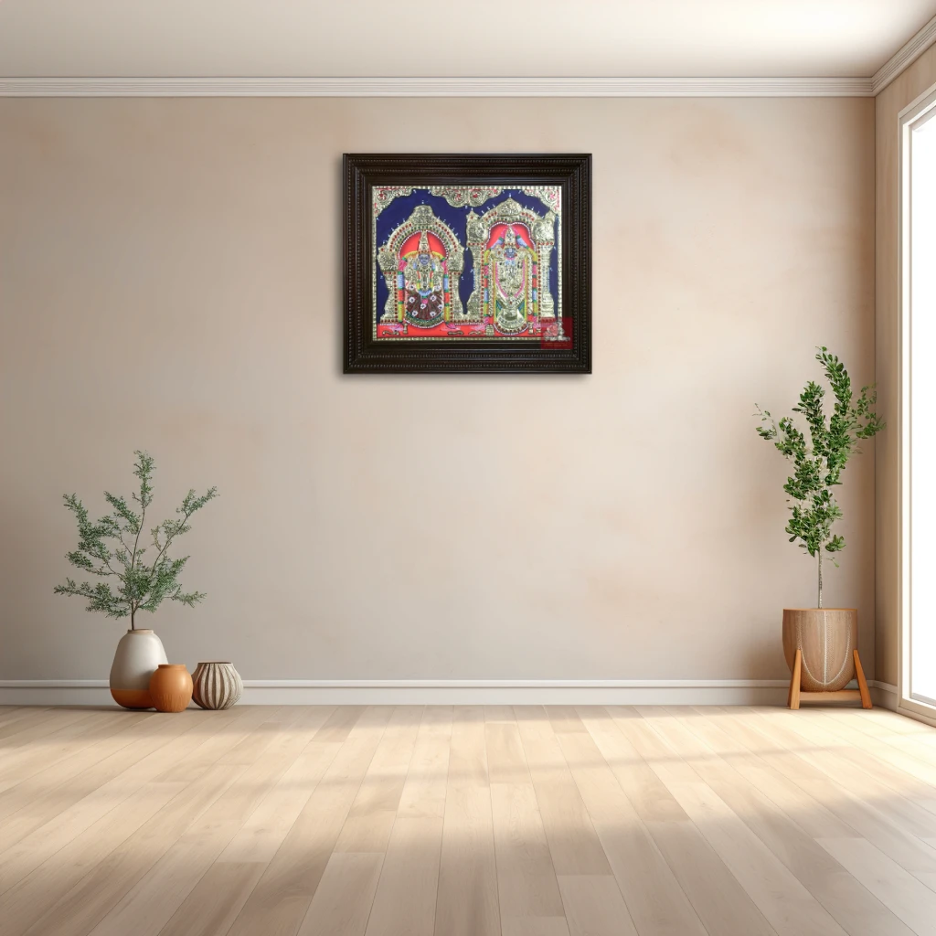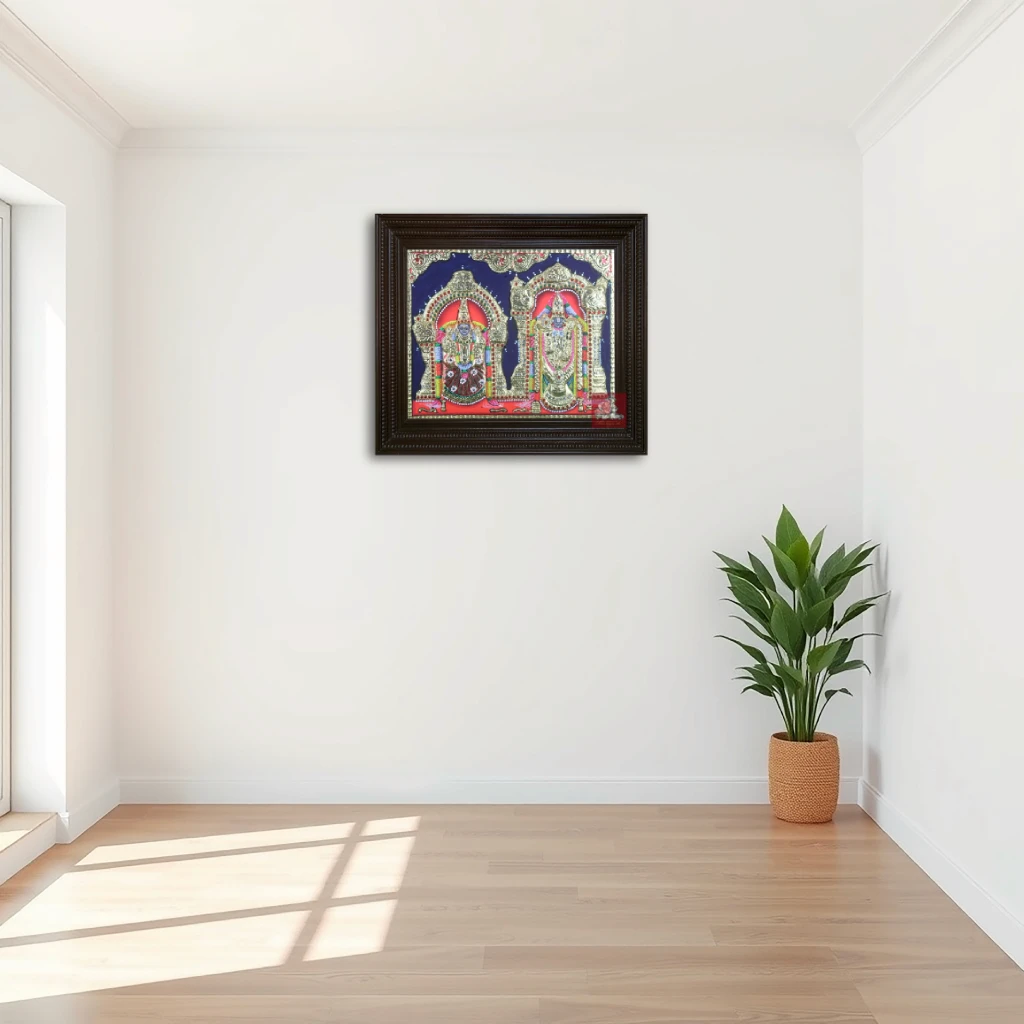 With the background of deep blue, red and radiant gold, this Tanjore Painting depicting the images of Perumal and Thayar (Goddess Lakshmi), is a masterpiece. Both the deities are carefully crafted and grace and divine poses. Their jewelleries and traditional attires are grandly decorated with gold foils and contrasting colour choices to elevate the visuals of the painting. The temple arch at the backdrop enhances the spiritual presence of the deities. Together the deities symbolise divine grace, love and protection. It can be used to decorate your home or can be given as a gift for weddings and housewarming ceremonies.