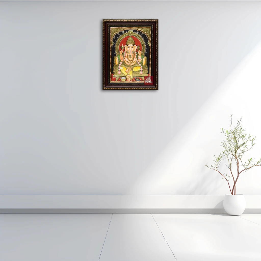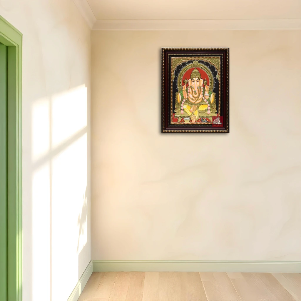 Name of Painting : Lord Vinayagar Tanjore Painting Finish: Gold Foil Type: Tanjore panting Type of frame: Chettinad wooden colour: Multi-colored pack content: 1pc Material: Plywood, Chalk powder, Gold foil, Semi precious stones